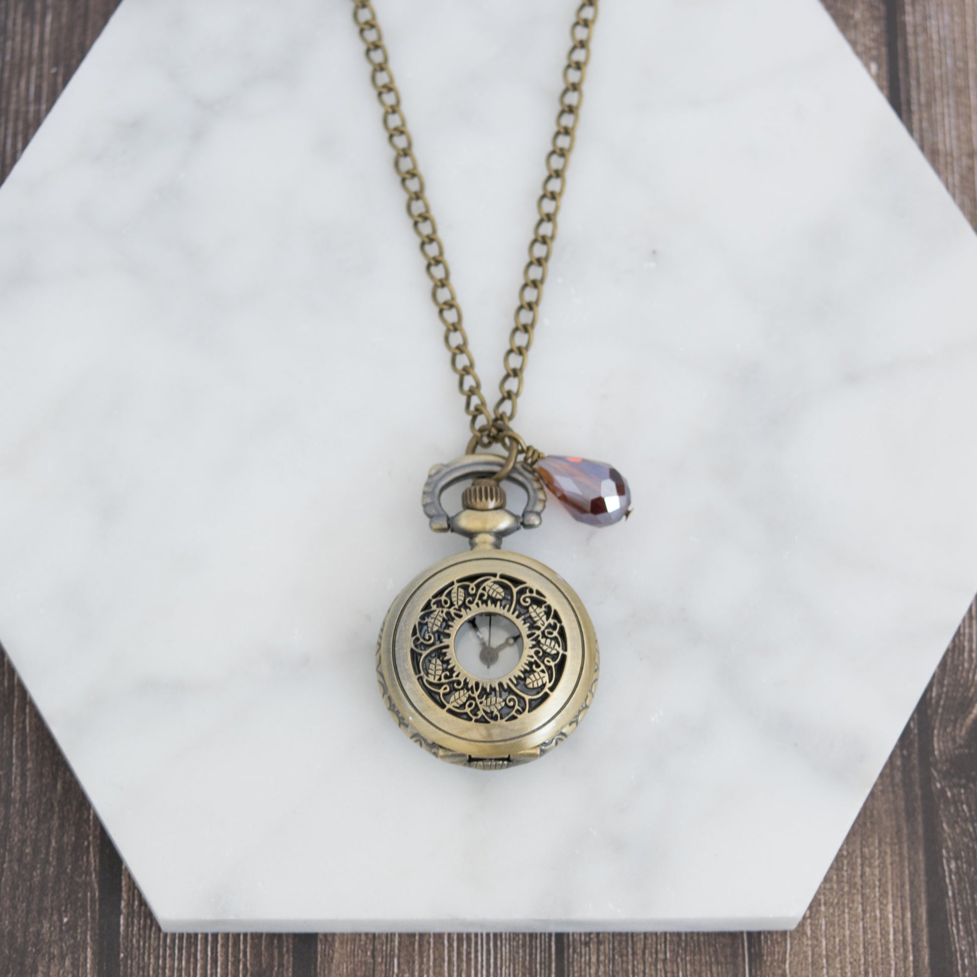 Embrace the allure of yesteryear with our small antique bronze pocket watch. Each one is uniquely adorned with a delicately wire-wrapped bead.