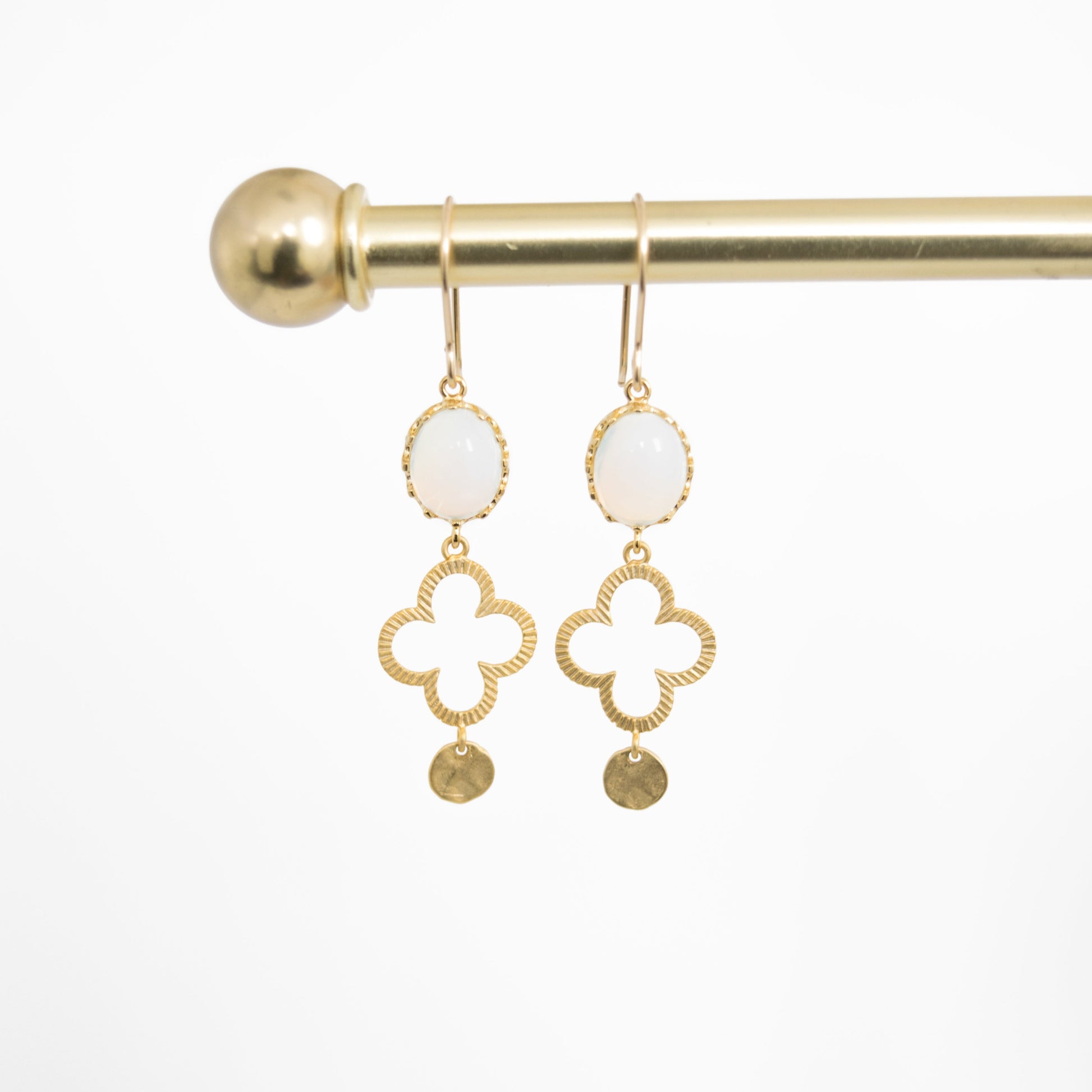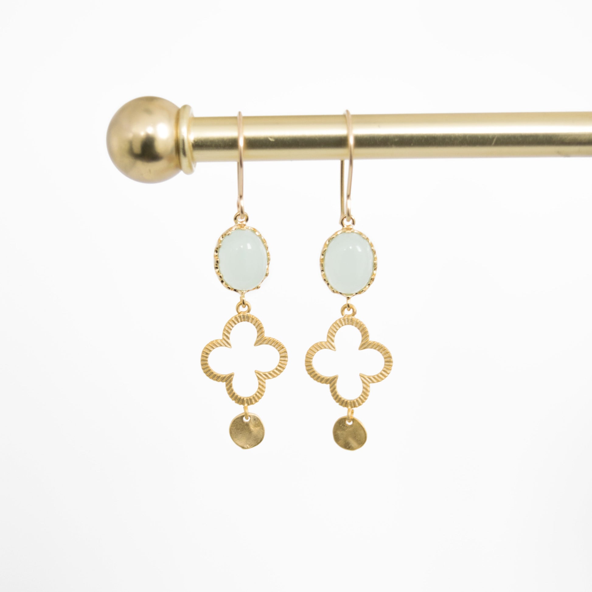 Featuring a captivating oval framed connector in either opal or cloudy mint green, these beauties connect to a delicate clover with a small circle charm.