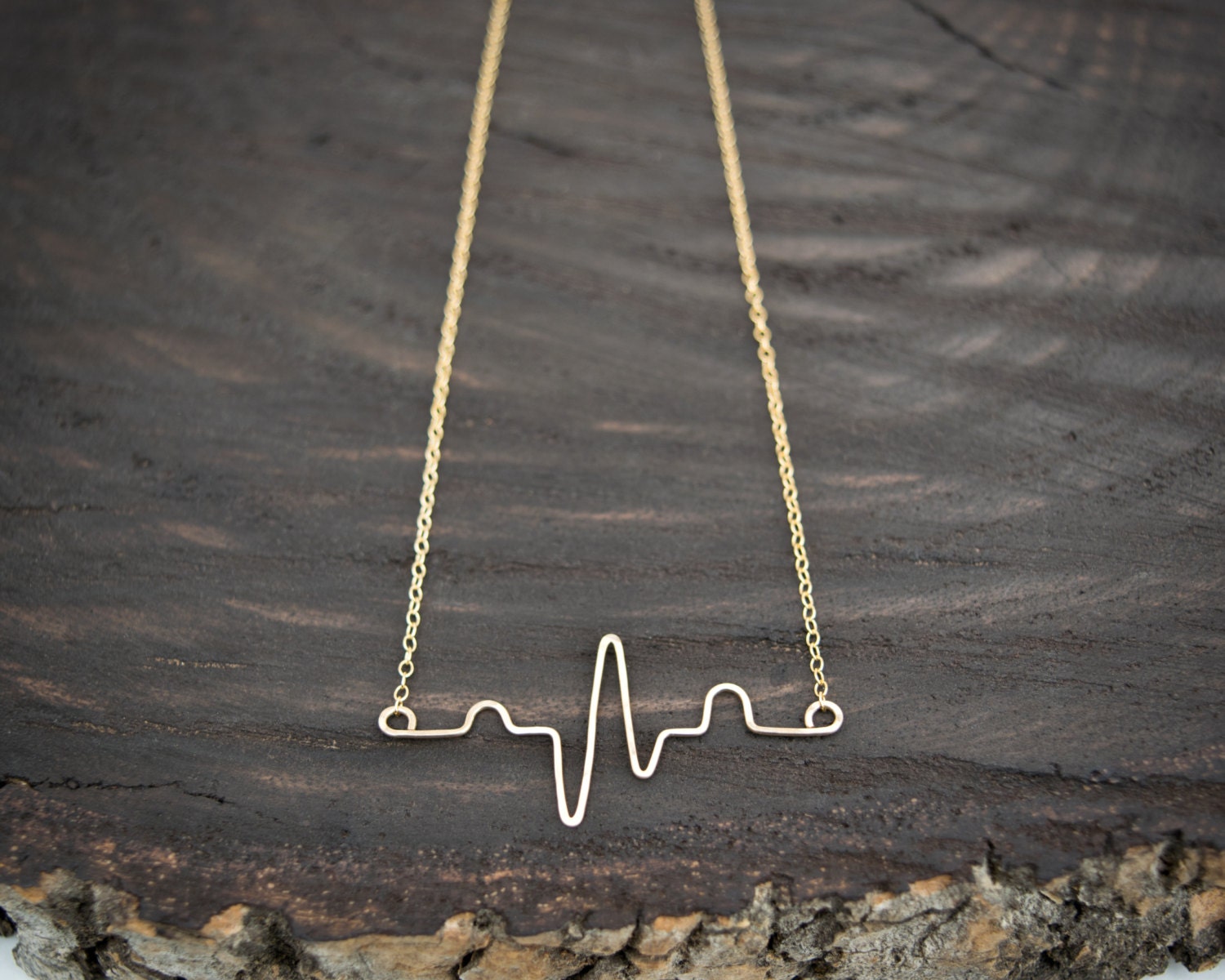 Hand formed and hammered EKG pendant is hung on a gleaming cable chain necklace, finished off by two 4mm red crystal bicone beads wire wrapped onto a clasp. For once, carry your heart [beat] outside of your chest!