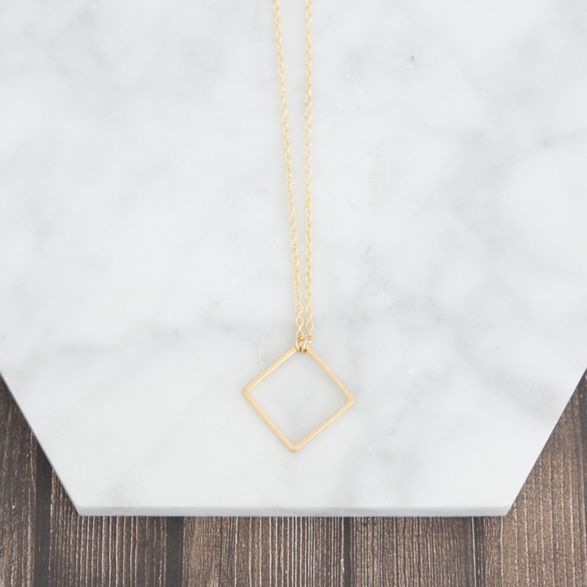 A beautiful balance of simplicity and charm makes this the ideal wear-everywhere necklace. A matte gold square pendant is suspended from a dainty cable chain.