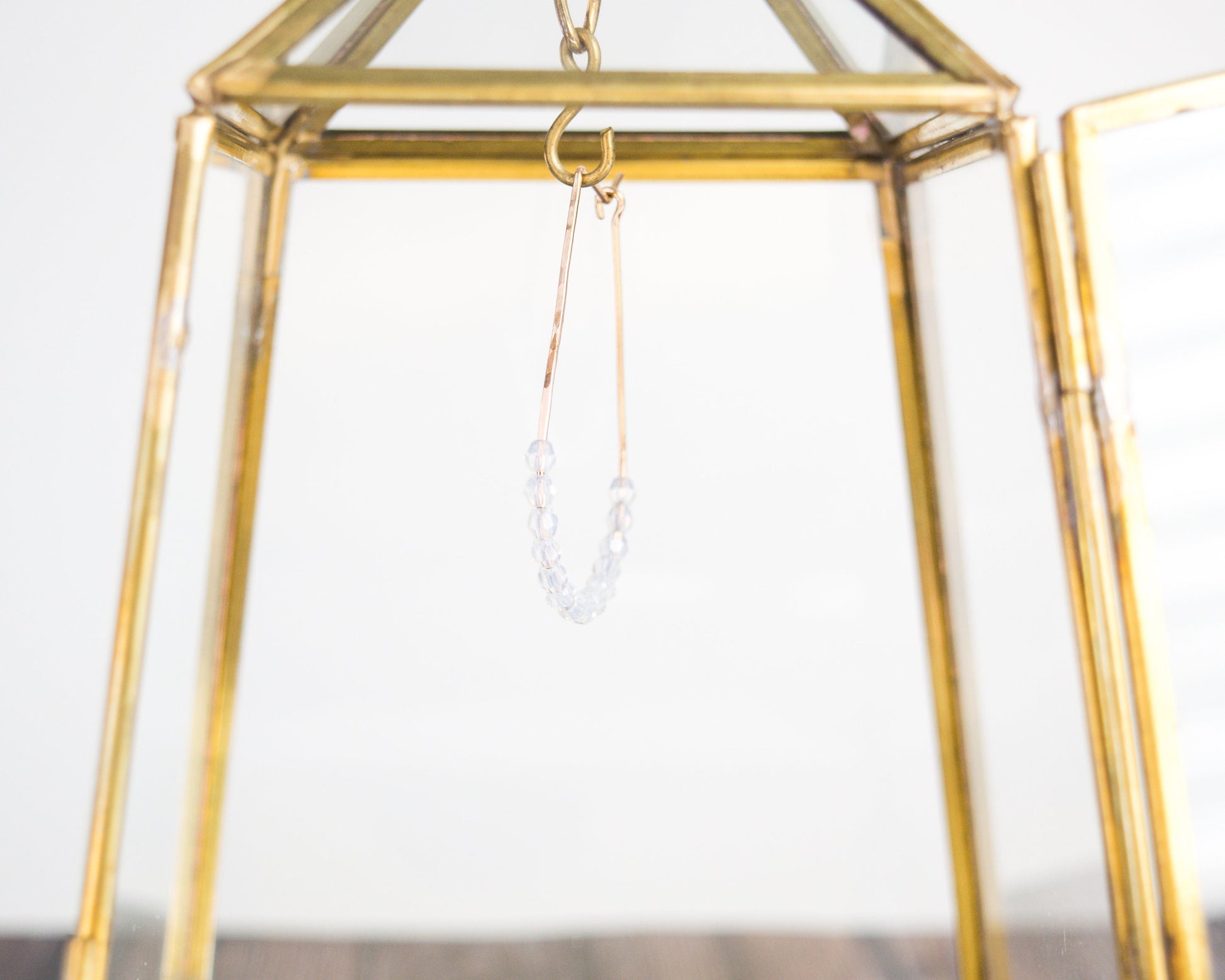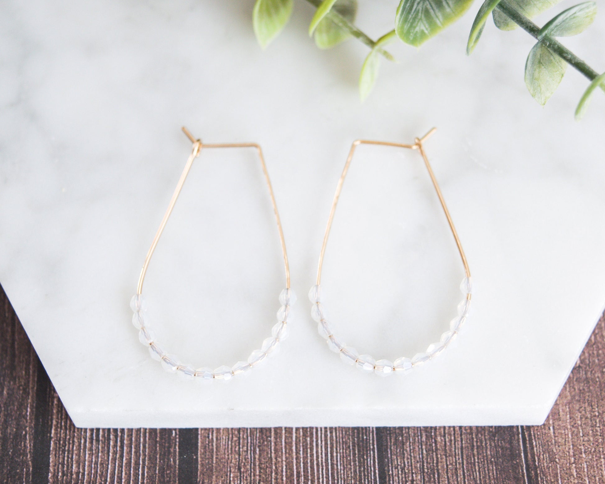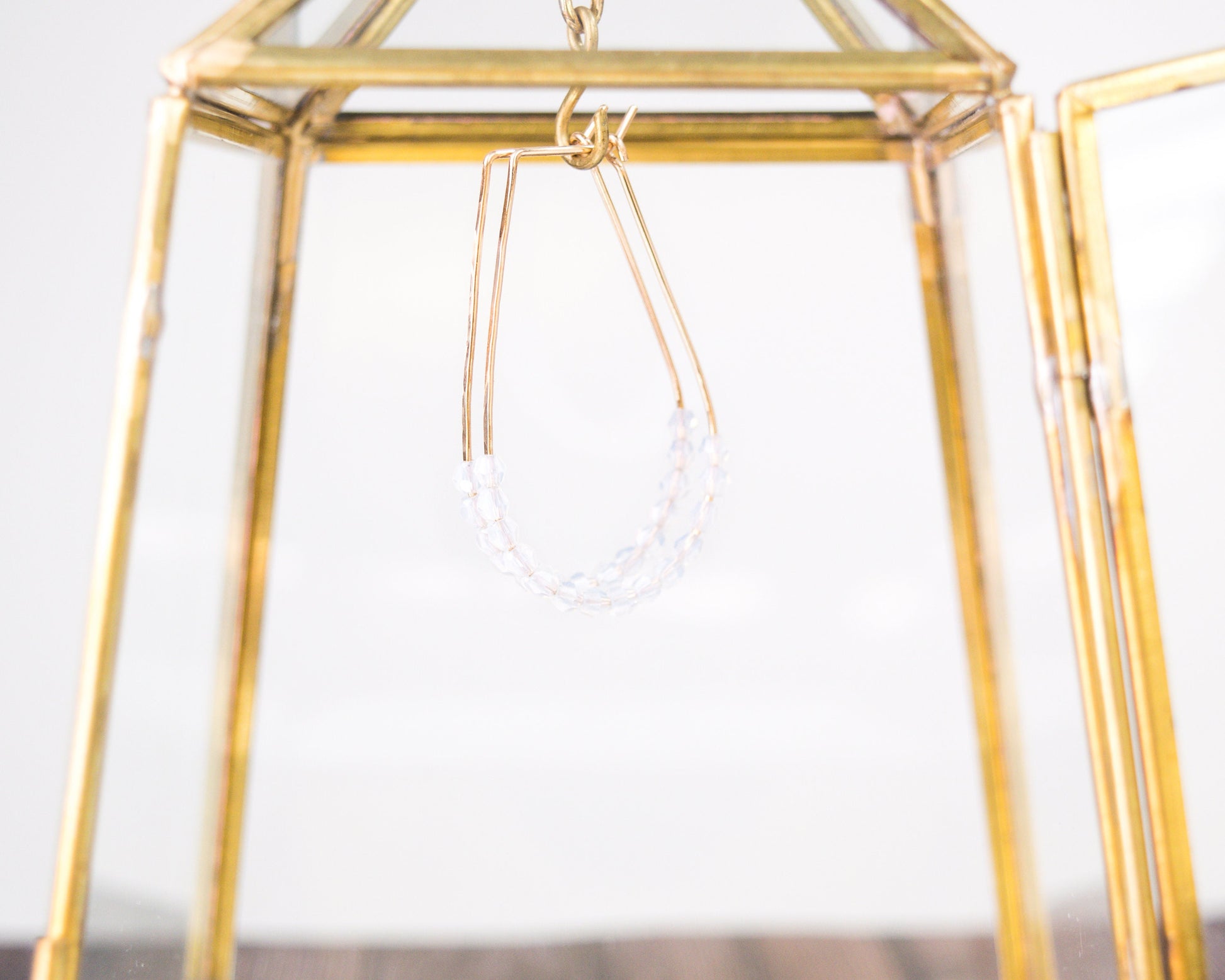 14k gold-filled wire is hand formed and hammered into a gracefully curved teardrop shaped hoop. Each teardrop shaped earring is beaded with 14 beautiful round Swarovski crystal opal beads. The hook closure keeps them locked in place so you'll never lose an earring while wearing them. Add a classic touch with these face framing earrings to complement any look.