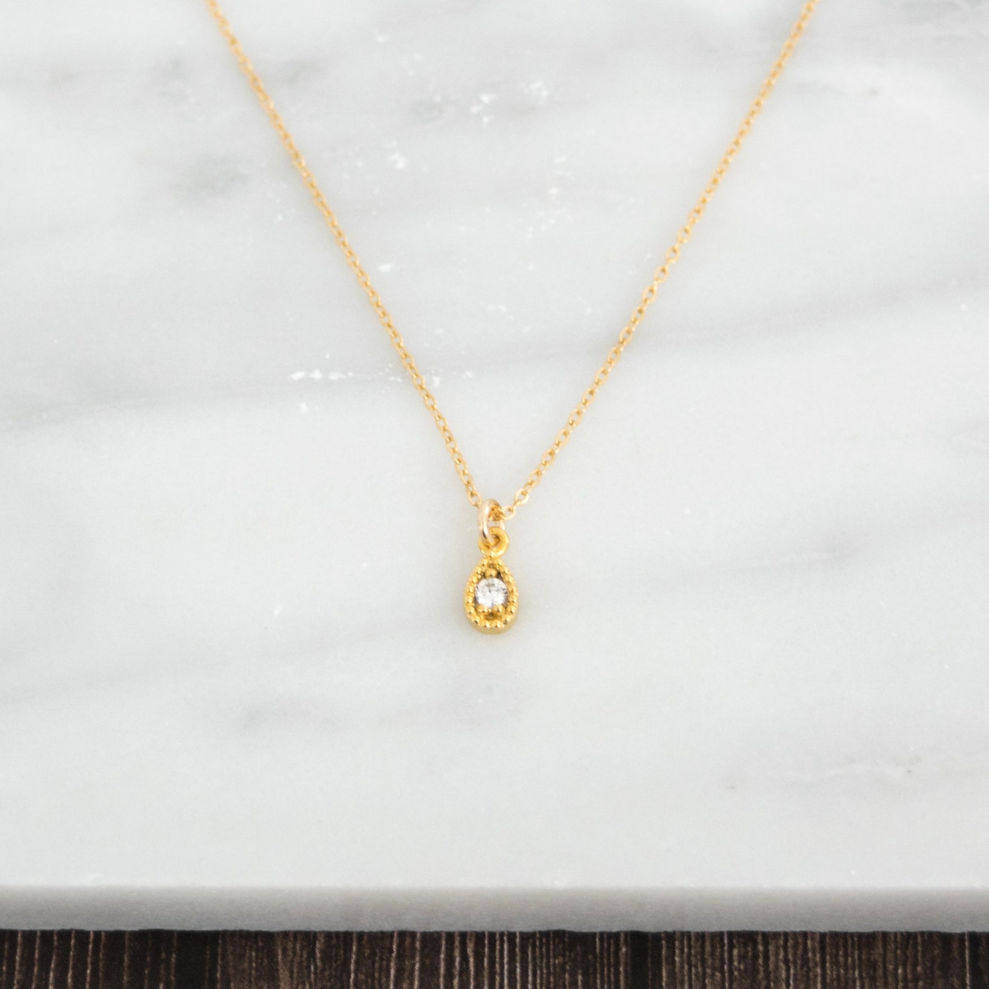 A tiny teardrop-shaped pendant, featuring a small cubic zirconia at its center, hangs gracefully on a cable chain. Whether worn solo for a touch of delicate charm or layered with other necklaces, it's the perfect piece to elevate your style.